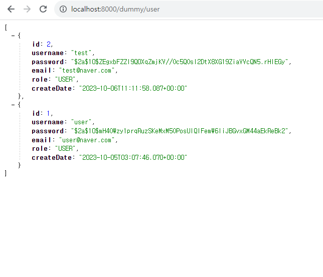 페이징처리 흔히 게시판이나 상품 목록 또는 공지사항을 보면 글이 스크롤을 따라 쭉 내려오는 경우도 있지만, 그 글이 수천개 수만개가 되면 페이징 처리를 해주게 된다. 이를 Controller에서 Select할때 @PageableDefault를 사용하면 편리하게 페이징처리를 해줄 수 있다. @PageableDefault 이는 페이징 처리할때 사용하는 어노테이션으로 파라미터값을 요청하여 페이징에 필요한 정보를 얻어오는 역할을 한다. 말그대로 PageRequest와 같은 역할을 한다. 요청 파라미터는 아래와 같다. - page : 현재 페이지를 뜻하며 0부터 시작된다. - size : 한 페이지에 노출할 데이터 건수를 말한다. - sort : 어떻게 정렬할 것인지를 의미한다. 예시 DB에 두 건의 User정보..